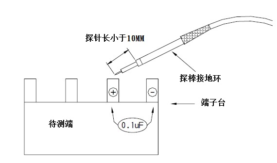 在S.P.S.涟波噪声中含有2 种成分,一是交流输入电压的倍频频率,另一为S.P.S.本身的切换频率。由于是高频噪声,在量测时,示波器带宽应设在20MHz,且探棒应以最短距离来量测;并在待测端加一小电容(0.1uF)来滤除噪声干扰,如下图所示。