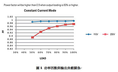 具功因矫正功能机型,PF值如要求需大于0.9,负载需大于规格书PFC定义范围,功率因子与输出负载关系如图(1)所示,会依机型定义不同,一般设计值为75% LOAD以上。