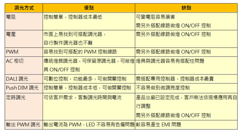 明纬LED调光产品会依照灯具应用的场合或市场需求设计搭配的调光方式,建议先以灯具应 用类别选择LED产品,再依原产品的调光方式选择调光器,如果不考虑应用场合,单比较调光方式优缺点如下。